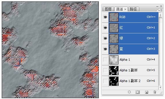 | 4、在三个通道中,前两个为作为光照效果的所需的纹理通道,“Alpha1通道”是为了获得墙面的不平整效果,“Alpha1通道副本”是为了获得破损部分,“Alpha1通道副本2”为删除不需要部分的选区通道。在“砖墙”图片的上新建一个图层填充灰色,执行“光照效果”滤镜,“纹理通道”选择为“Alpha1”。 |