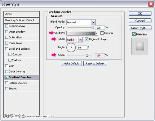 | 2、双击图层,添加渐变叠加样式,模式正常,样式径向,缩放120%。 |