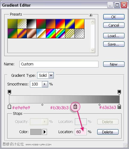 | 3、创建一个三色的渐变(可以通过点击色标滑块添加颜色),左侧颜色为#e9e9e9,右侧为#636363,中间颜色为#b3b3b3,确保中间颜色的位置是60%。 |
