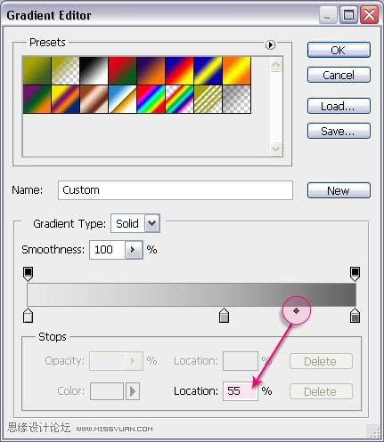 | 4、点击中间滑块添加颜色#b3b3b3时,会出现两个小方格,一左一右,点击右侧的一个,位置调整为55%。 |