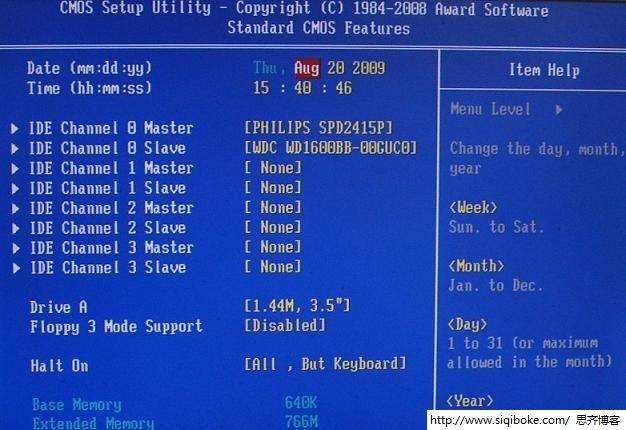 在我们启动计算机时迅速按下键盘右下角的Del键,如果是笔记本的话则一般按下F2键,即可进入BIOS设置界面,一般的BIOS设置界面如下: