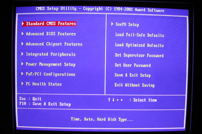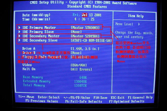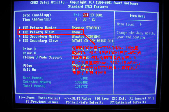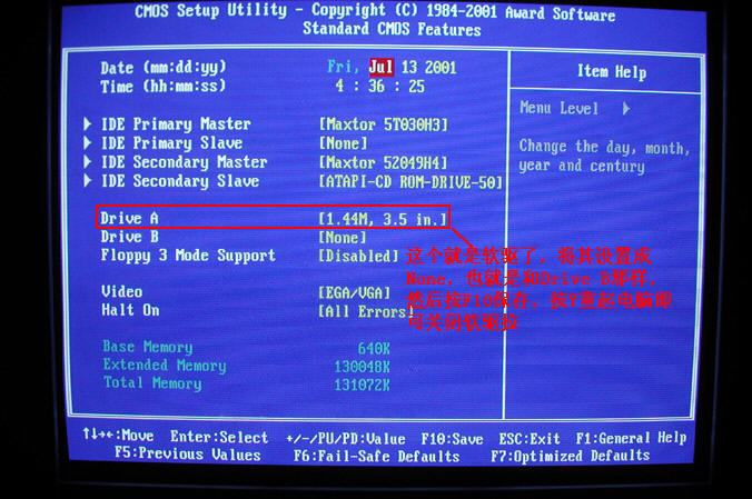 Standard CMOS Features(标准CMOS功能设置) 第一项 这一项主要是设置时间,查看IDE设备,检查内存大小,查看软驱状态,还有一个是设置BIOS密码 必须设置的一项哦,这里只讲最常用的。 1.关闭软驱。 Standard CMOS Features 选中它按回车进入,然后Drive A这一项默认的是[1.44M, 3.5 in.]或者有的是[2.88M, 3.5 in.]选中它,然后按键盘上的page Down键调节到None,或者选中它按回车,用键盘光标选择 None。如果你的软驱有两个, 那也要将Drive B关闭,设置完后按F10按Y保存,重起电脑即可关闭软驱。详细请看图片2