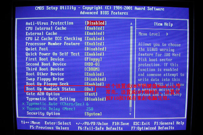 4.设置num Lock灯常亮。 Boot Up NumLock Status(初始数字小键盘的锁定状态) 设置为“On”时,系统启动后,键盘右边小键盘是数字键状态;设置为“Off”时,是方向键状态。缺省值为“On”。 详细请看图片8