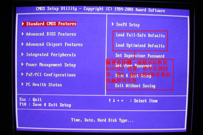 这项讲到这里。 Power Management Setup(电源管理设置) 这一项也只讲一点。 解决电脑关机变重起。 电脑在正常关闭时却自动重启,一般是由于主板电源管理出现问题所致。有些主板的电源管理部件,由于受布线设计和零件质量的影响,对电平信号的响应不是很精确。由于在主板切断电源的瞬间会产生一个瞬间高压,这个高压存在时间很短,对硬件产生的损坏作用极小,但是通常会使网卡、调制解调器等PCI设备产生一个微小脉冲。如果没有判定为噪音信号,且你的主板BIOS中开启了自动唤醒功能的话,主板就会检测到网卡等设备的外部连接请求,于是自动开机。这种原因是由于硬件引起的,所以单纯刷新主板BI0S是不能解决问题的。可以试着在主板BIOS中关闭自动唤醒功能试试。在BIOS中将Wake up by pci card和wake up by lan设为Disabled. 这一项设置详细请看图片10om/Tmp_updir/article/57/201002/1_2koev__200631323235662971.jpg border=0> Load Fail-Safe Defaults(载入最安全的缺省值) 和Load Optimized Defaults(装入最优化的缺省值) 这两项都可以使BIOS设置恢复到出厂设置,详细方法请看图片11