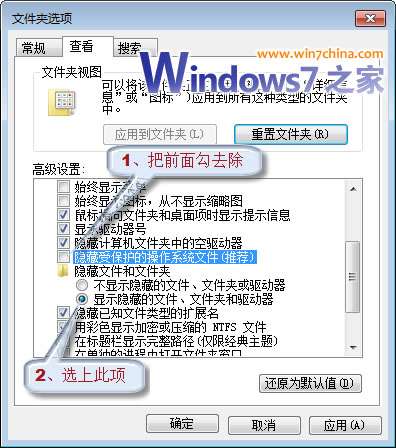 ① 打开“控制面板”,点击“外观和个性化”,找到并点击“文件夹选项”下方的“显示隐藏的文件和文件夹”,在弹出的“文件夹选项”对话框中,将“隐藏受保护的操作系统文件(推荐)”前面的勾去除,再选上“显示隐藏的文件和文件夹”,点击“确定”使计算机所有文件和文件夹都显示出来。