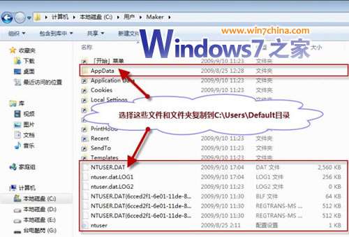 ③ 将刚被禁用用户帐户的文件夹(Maker)里面的“AppData”文件夹和NTUSER.DAT、 ntuser.dat.LOG1 、 ntuser.dat.LOG2 、 NTUSER.DAT{xxxxxxxx-xxxx-xxxx-xxxx-xxxxxxxxxxxx}.TM.blf、 NTUSER.DAT{xxxxxxxx-xxxx-xxxx-xxxx- xxxxxxxxxxxx}.TMContainer00000000000000000001.regtrans-ms、 NTUSER.DAT{xxxxxxxx-xxxx-xxxx-xxxx-xxxxxxxxxxxx}.TMContainer00000000000000000002.regtrans-ms 、 ntuser.ini(如果有SciTE.sessio、全局缩写.properties这2个文件的话,也要选上)复制到默认用户的文件夹(C:UsersDefault)内,复制过程中如果提示有文件或文件夹同名则点击“确定”覆盖或合并即可。
