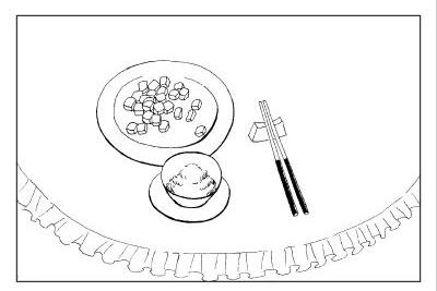 (5) 食盘是用来放菜的。一次取菜不宜过多。不宜入口的废弃物,可以堆放在盘中,不要直接吐在餐桌上或地上。