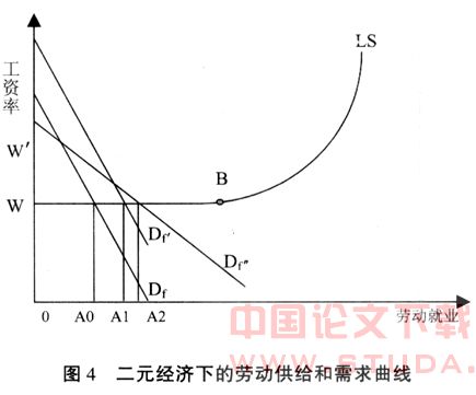 为功能性分配效应。其中φ′W为非农业部门的劳动收入份额。功能性分配效应是受制于生产函数、资本密集度和技术变迁等因素引致的劳动收入份额变化对总体基尼系数的影响。由于工资收入相对资本收入总是平等一些,即(GL-GK)<0;所以在功能分配效应对总体基尼系数影响的分析主要集中在变量上。因此有利于劳动力收入的政策和技术进步,即(GL-GK)<0,总是会降低总体基尼系数,有利于收入差距的缩小。但是在劳动力过剩的发展中国家,由于二元经济的存在,在转折点B之前(见图4),农业劳动收入低于制度性工资,在经济发展过程中,工资几乎不变或者只有微幅的提高。在转折点B之后,劳动供给曲线LS才会向上倾斜,工资才会上升。但是在转折点之前,资本节约型技术对劳动的需求曲线Df比劳动节约型技术对劳动需求曲线Df更有助于农业劳动向非农业劳动的转移,提高社会的劳动就业,提高φ′W。的份额;在不改变资本和劳动比率条件下的中性技术进步和创新也可以提高劳动工资份额和资本收益,使得厂商对劳动的需求曲线向右移动,例如D′f因此只要是技术进步和创新频率的上升总是具有提高劳动要素收入和扩大吸引劳动力的双重效用,可以提高φ′W的份额等,有利于降低总体基尼系数。