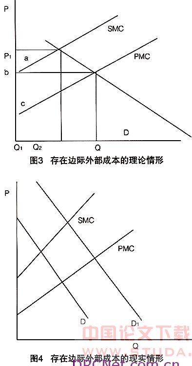 图1横轴表示生产与消费时会产生污染的产品数量,纵轴代表产品的价格,PMC线(即私人边际成本线)为厂商的供给曲线。自由市场的均衡产出量和价格分别是Q2、P2。如果考虑环境成本,曲线PMC并不代表产品的实际社会成本。假设单位产品在生产和消费时必须承担2美元的环境成本则单位产品产出时就应当缴纳2美元的销售税或费用,从而得到实际社会边际成本SMC。如图1ac即为2美元的环境成本。需求曲线D和社会边际成本曲线SMC的新交点Q1是有效产量,P1则是相应的价格。因此,考虑环境成本后污染产品的实际产出量将由Q2降低到社会最优产量Q1,对消费者收取的价格从P2上升到P1。根据需求曲线和供给曲线的相对弹性,额外支付的2美元应由生产者和消费者共同分担。如果政府明确界定环境资源的产权,则受污染损害的第三方有权索取2美元的赔偿。综上所述,通过环境成本内在化的措施可以减少污染的产品数量,使之达到社会最优水平。
