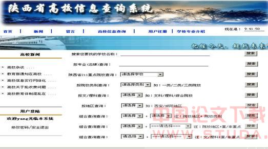 根据需求分析,本系统开发设计的目的是设计一个适合各个学校和社会其它部门或单位对陕西省高校的信息进行查询的一个网上查询系统,用户可以在网上迅速地按不同类别查找到自己所关注的学校的相关信息和所需要的资料,包括所要查找的高校的建校时间、建校历史、学校师资、基建规模、院系设置、硕士点、博士点等其它的关于该学校的主要信息,使得用户对信息的查找变的轻松、快捷和方便。