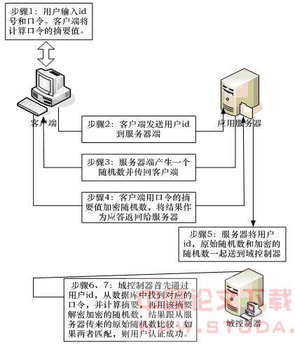 (7)域控制器通过比较从服务器端传来随机数加密结果(第5步)和自身计算得到的结果(第6步)的一致性,来判断用户的身份是否合法。