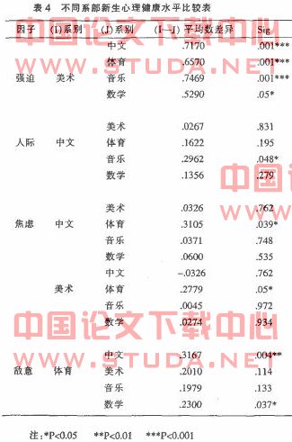 经过单因素方差分析,发现不同系部在强迫(F=6.859、P=.001料)、人际fF=7.030、P=.00l料)、焦虑(F=4.958、P=.05*)、敌意(F=9.454、P=.oo0料)等因子上,存在显著差异。为进一步明确系部间具体差异,进行事后假设检验,结果如表4。