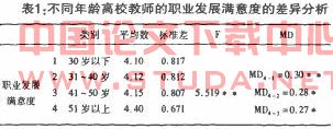 由表1可知,不同年龄组的高校教师在职业发展满意度的感知上存在差异。其基本趋势是,年龄越大,高校教师的职业发展满意程度越高。其中50岁以上的高校教师组显著高于其他年龄组(P<O,01),而其他年龄组教师之间不存在显著差异(P>O,05)。产生这一结果的原因可能与高校教师的职业发展周期有关。50岁以上年龄组的高校教师处于职业发展的中后期,全部精力倾注在自己热爱的事业上,职业成就、事业成功成为自己一生的追求并有所建树,长期人力资本的投入,使高校教师在自己从事的领域形成了系统的积累,带给自己超边际的收益,与年轻教师不同,创新成本的投入带来职业效用的倍增效应。另外,可能与收入有关,资历因素在收入分配中占有较高比重,职务高,收入高,50岁以上年龄组的收人满意度高于年轻教师。