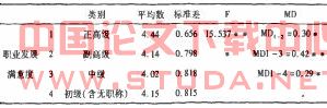 由表2可知,不同专业技术职务组的高校教师在职业发展满意度的感知上存在差异,其总体趋势是,专业技术职务越高,教师职业的满意程度越高。其中正高级组(正教授或研究员)显著高于其他专业技术职务组(P<o,01)。高校教师的专业技术职务对其成就动机水平有显著影响,期望事业成功(成名成家)已经成为高校教师的精神支柱与奋斗目标。而高级专业技术职务的获取正是高校教师成就学术地位、社会地位的象征。因此。教授职务的教师有较其他职务教师更高的职业发展满意度。同样从具有中级职称开始,高校教师的职业发展满意度随教师职务升高而增加的趋势。而只具有初级,甚至没有职称的高校教师对于职业发展的期望水平相对比较低,所以他们对于职业发展的满意程度反而高于具有副高或中级职称的教师。