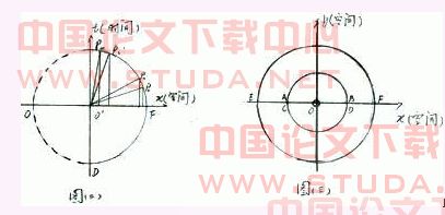 如果我们沿中线切开模型,从横断面看一侧,如图2。则物质由O经内侧至D,再经外侧F至B,再经内侧至O点的过程,可看成是经O-D-F-B的过程,这类似粒子在时空图中做匀速运动。如果把这一过程投影在空间轴上,则这一过程又形成一个简谐振动过程。假设规定空间轴由模型外部指向内部为正,则图2中粒子运动在空间轴上的投影,在D-F-B段,力为正,以引力为主;在B-O-D阶段,力为负,以斥力为主。粒子在时空图中B、D点上的运动速度在空间轴上的投影,其速率最大,方向相反,而加速度为零。在O、F点处运动速度在空间轴上投影速度为零,但加速度绝对值最大,且符号相反。如果把上述过程投影在二维空间平面上(图3),则可见,宇宙初期为超光速加速膨胀,以斥力为主,为罗氏空间,空间曲率为负,为负能态区;当膨胀到一定尺度(r=rc或t=tc)时,宇宙开始低光速减速膨胀,此时以引力为主,为黎曼空间,空间曲率为正,为正能态区。由于引力的作用,宇宙膨胀到一定程度时,开始低光速加速收缩,此时仍为黎曼空间,仍以引力为主;当收缩的一定尺度(r=rc或t=tc,即视界面)时,宇宙开始超光速减速收缩,此时又以斥力为主,又为罗氏空间。宇宙就是这样循环往复的。