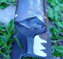 我国广深准高速铁路钢轨斜裂纹不同于以往的鱼鳞状剥离裂纹,一般不发展成剥离掉 块,裂纹萌生后沿钢轨作用边,呈 45°角,迎行车方向朝钢轨踏面中心扩展。裂纹发展到一 定程度后,便快速扩展成大尺寸横向疲劳裂纹,直至钢轨发生横向折断,严重危及行车安全