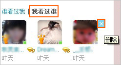 2、右边下方找到“我看过谁”,在这里会显示您最近访问过的空间记录(最多显示9个),把鼠标放在某个信息上会显示打叉的删除按钮,确认删除即可。